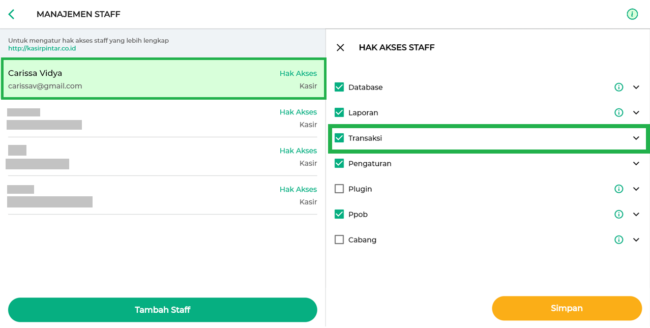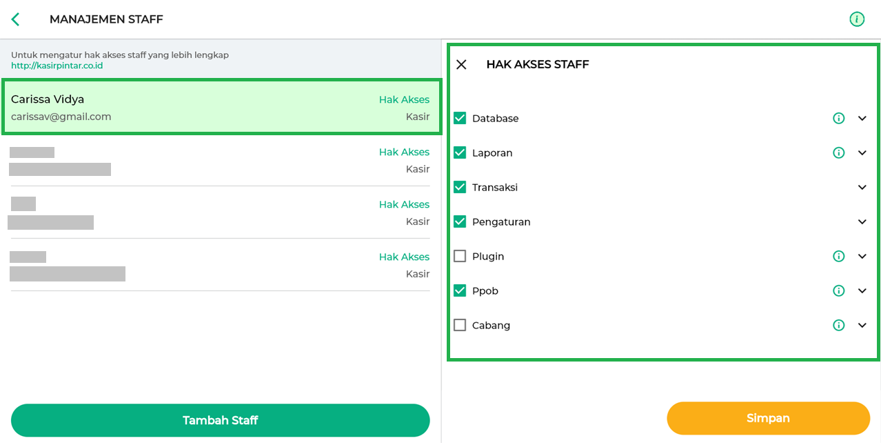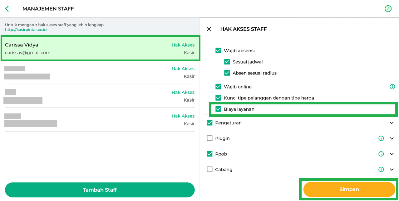 Berikut merupakan panduan untuk mengatur hak akses biaya layanan untuk staf yang diakses melalui aplikasi Kasir Pintar POS versi Desktop :