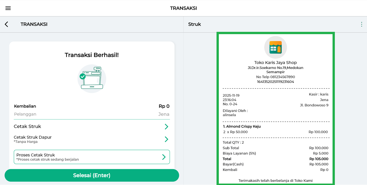 Transaksi berhasil. Sistem akan otomatis mencatat transaksi beserta biaya layanan, dan struk penjualan dengan biaya layanan akan tampil di sisi kanan layar.