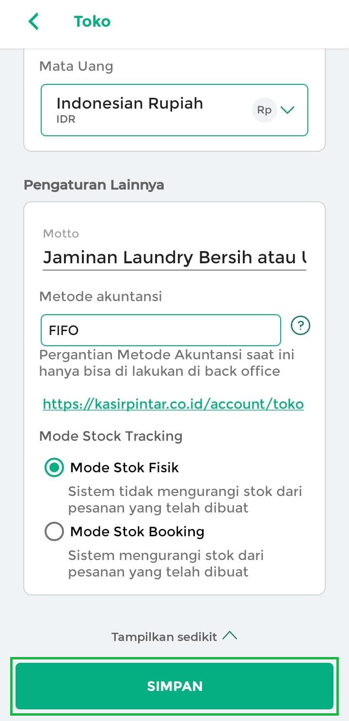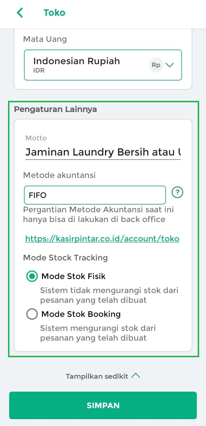 9. Melalui menu Pengaturan Lainnya, Anda bisa menyesuaikan toko agar terlihat lebih profesional dan tertata. Di sini, Anda dapat menambahkan motto bisnis, memilih metode akuntansi, serta menentukan mode stock tracking.