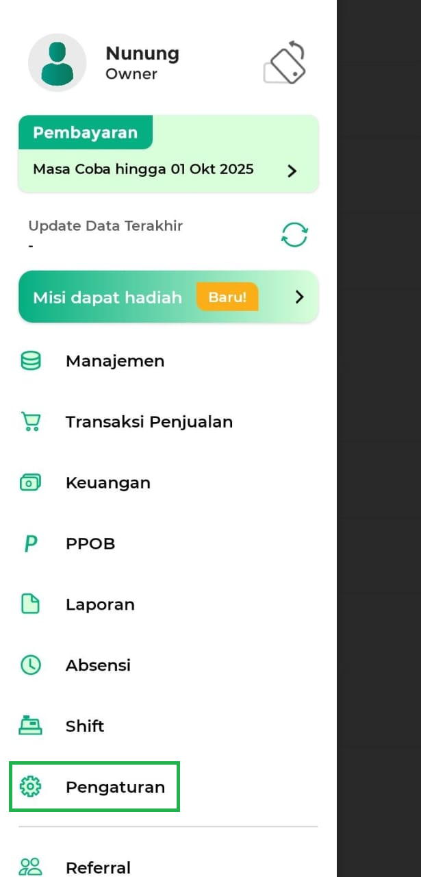 1. Buka aplikasi Kasir Pintar Pro dan klik ikon garis tiga di pojok kiri atas untuk membuka menu sidebar.