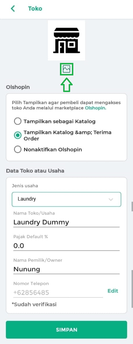4. Pada halaman ini, Anda bisa melengkapi data toko dengan menambahkan logo. Cukup klik ikon gambar, lalu pilih logo dari galeri atau album Anda. Logo toko juga dapat ditampilkan pada struk transaksi. Jika ingin menampilkannya, silakan lihat panduan di Cara Menampilkan Logo Toko di Struk.