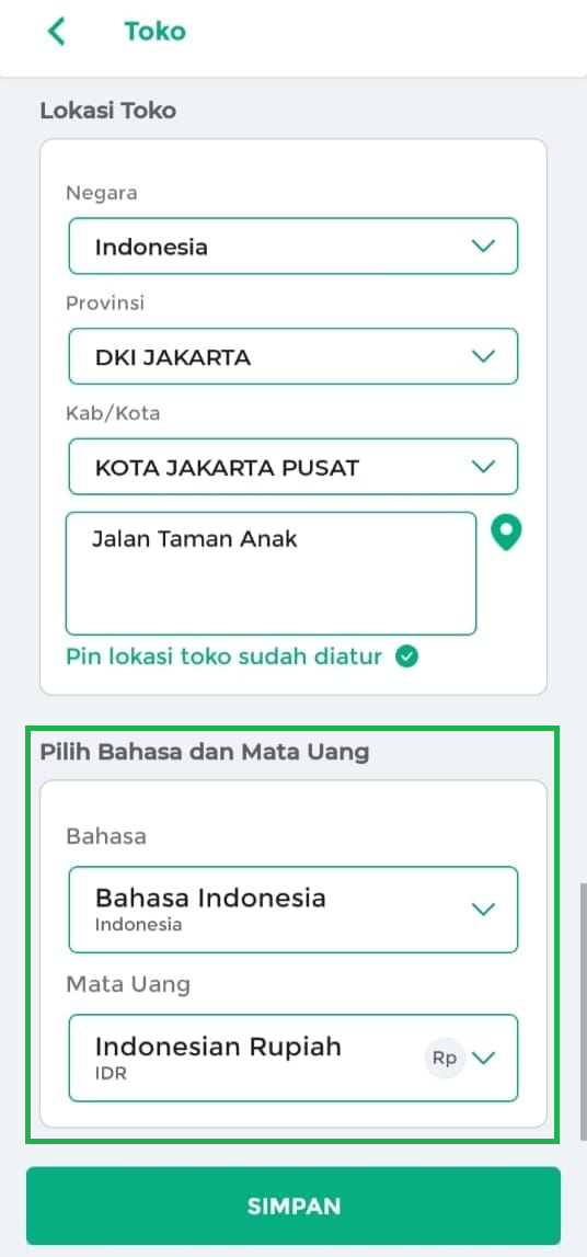 8. Anda dapat memilih Bahasa dan Mata Uang untuk operasional bisnis Anda.