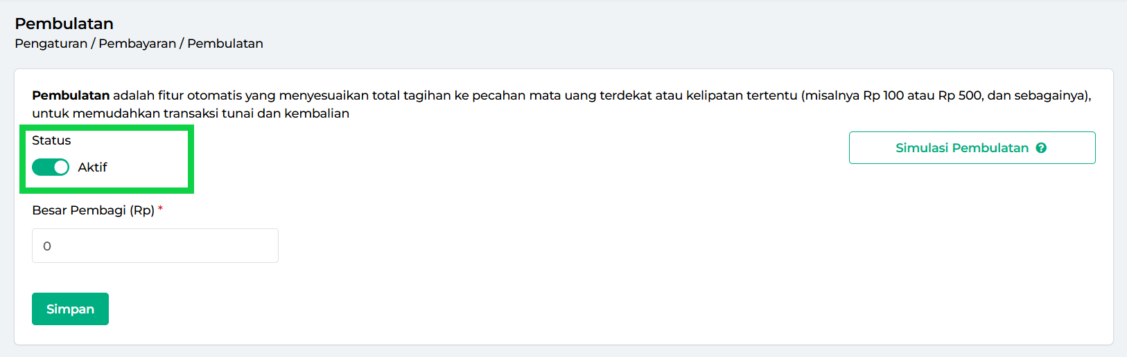 3. Aktifkan fitur pembulatan dengan cara klik toggle “Status” hingga berwarna hijau (Aktif).