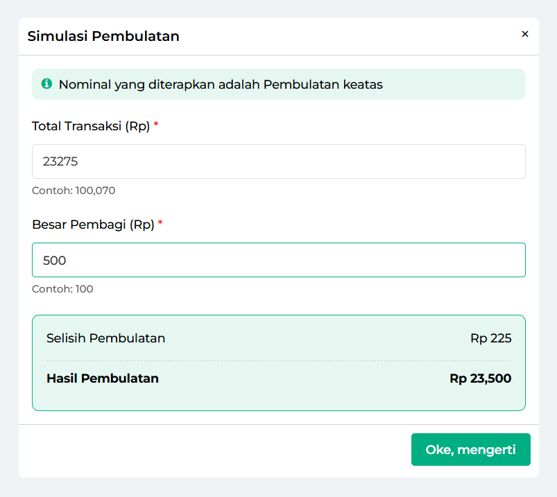 Sistem akan otomatis membulatkan total transaksi ke atas berdasarkan besar pembagi yang Anda tentukan.