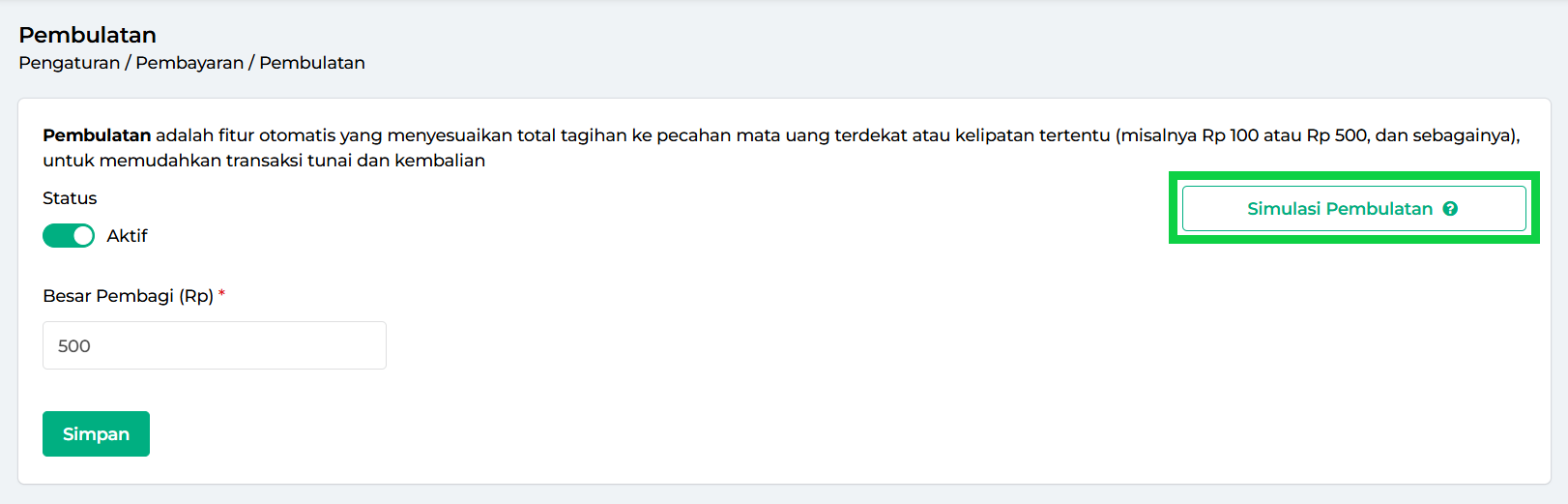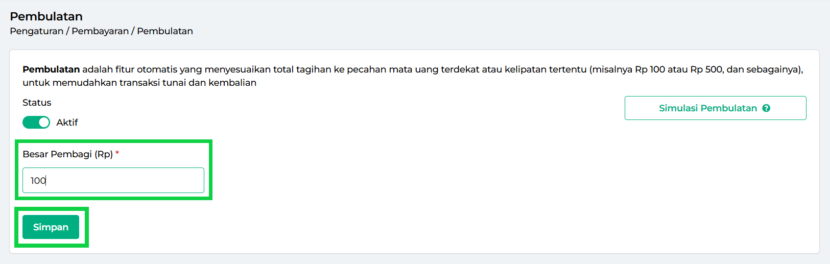 Fitur Pembulatan berfungsi untuk membulatkan total transaksi secara otomatis ke nominal tertentu sesuai pengaturan, seperti kelipatan 100, 500, atau 1.000. Nominal acuan pembulatan ini disebut Besar Pembagi.