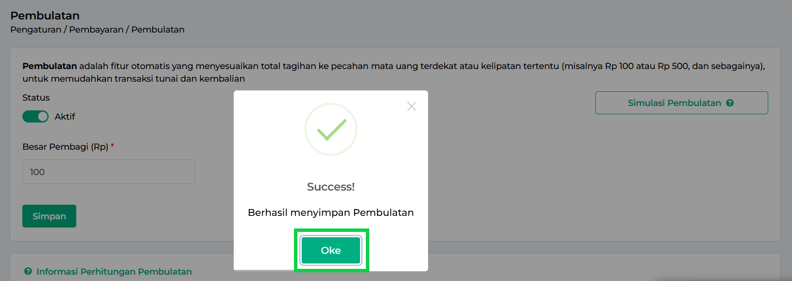Besar pembagi ini digunakan sebagai acuan sistem untuk membulatkan total transaksi pecahan, misalnya menjadi kelipatan 100, 500, atau 1.000 sesuai kebutuhan bisnis Anda.