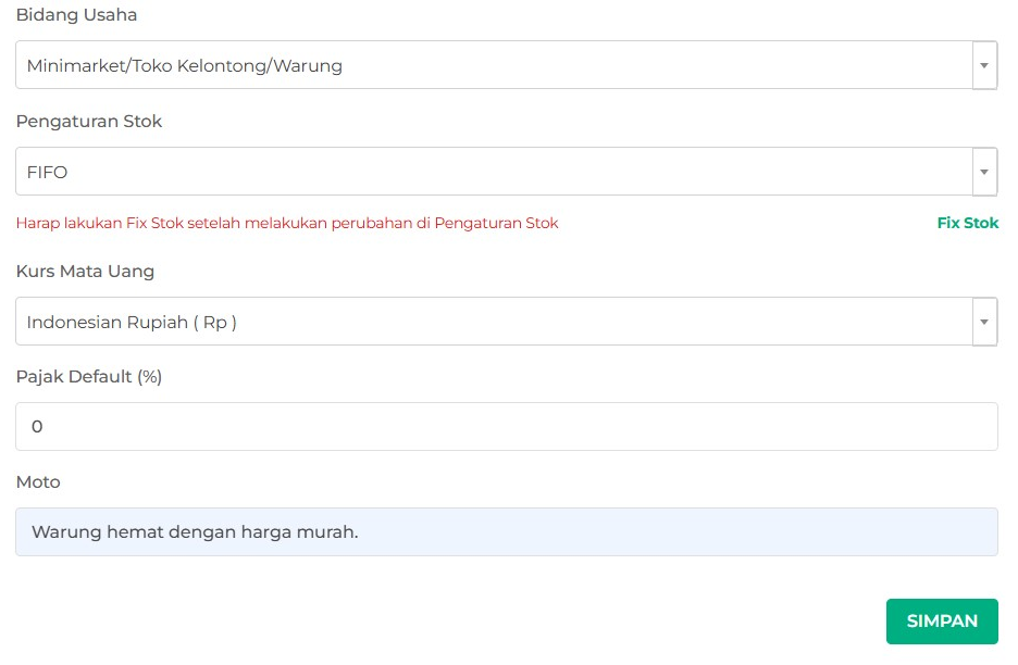 - Pengaturan Stok: Pilih metode pengelolaan stok sesuai kebutuhan (contoh: FIFO).