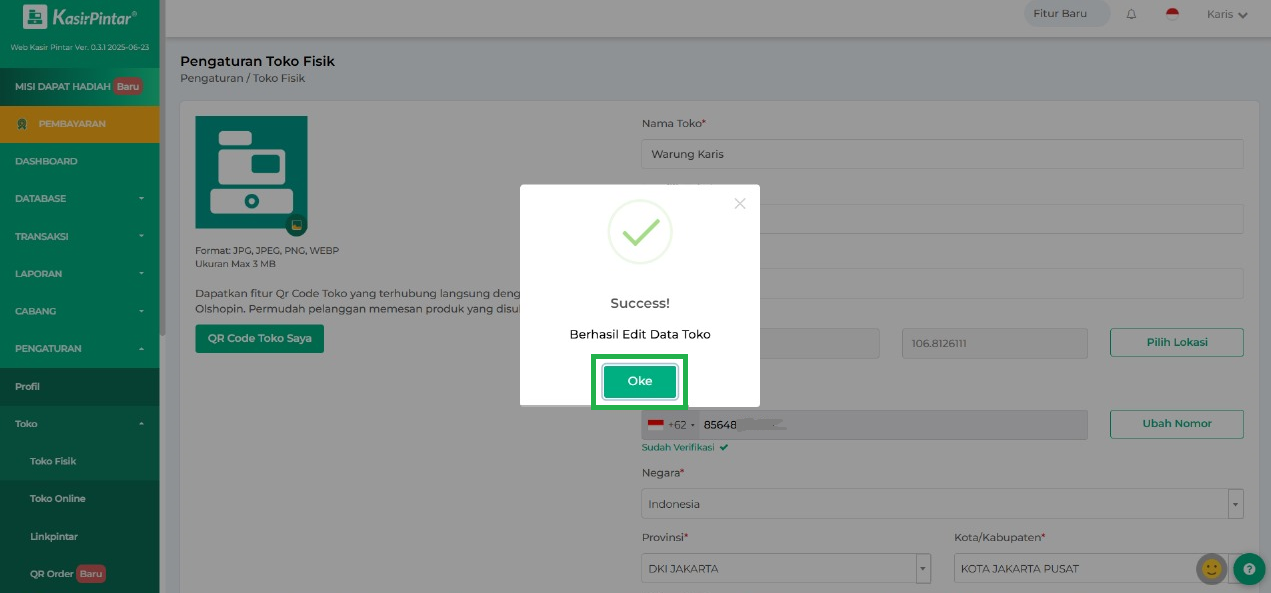 7. Klik Oke dan data toko Anda sudah berhasil diperbarui.