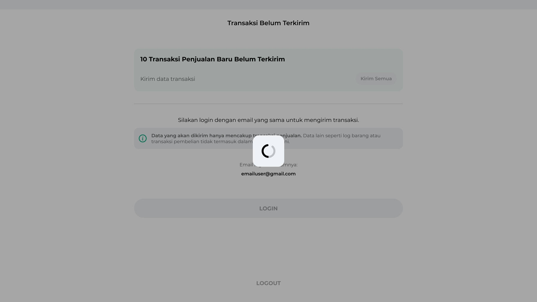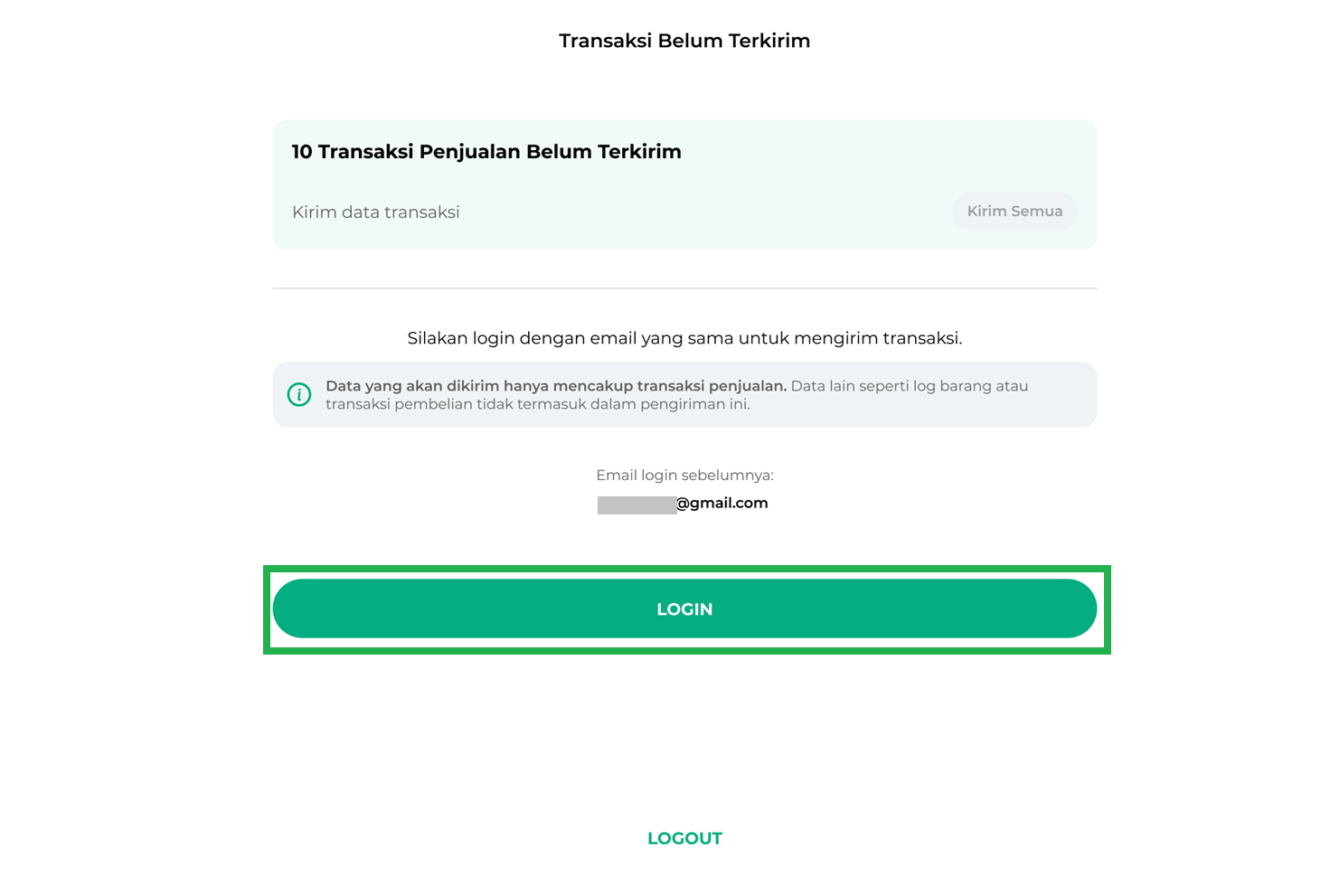 - Sistem akan menampilkan halaman transaksi yang belum terkirim seperti gambar berikut. Selanjutnya, klik tombol Login untuk melanjutkan proses pengiriman data transaksi.