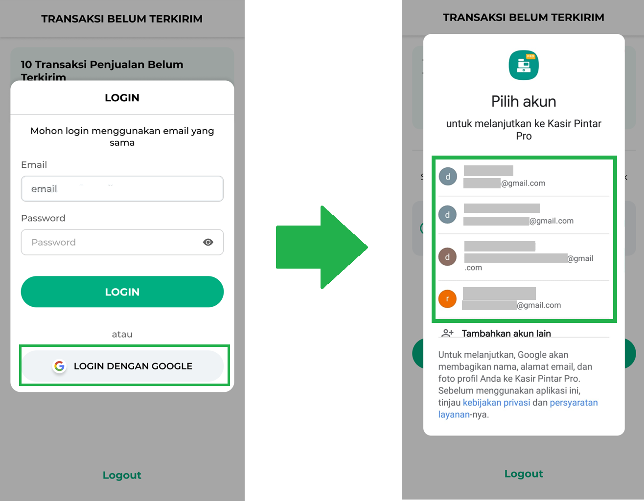 - Kemudian, login menggunakan akun Kasir Pintar yang telah terdaftar dengan email yang sama seperti saat login sebelumnya.