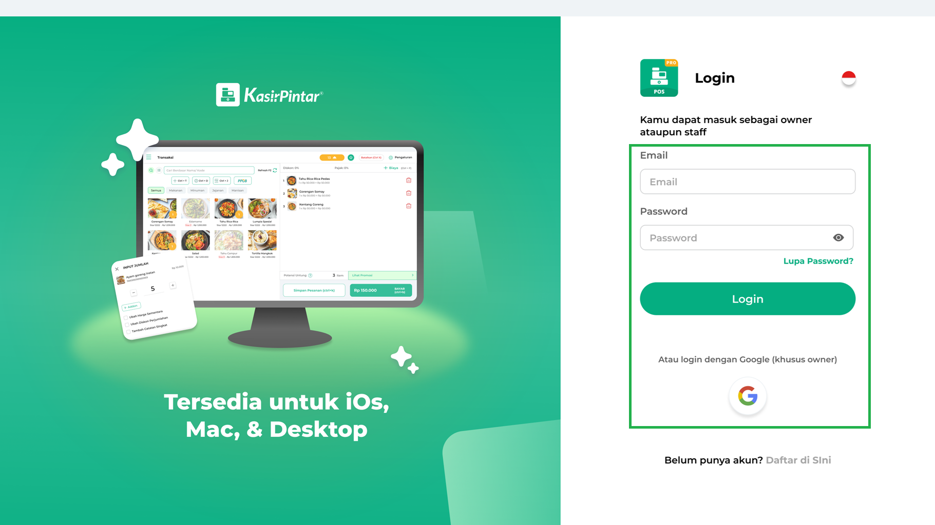 - Login dengan Google: Klik tombol Login dengan Google, lalu pilih email yang digunakan. Metode ini hanya tersedia untuk akun Owner.