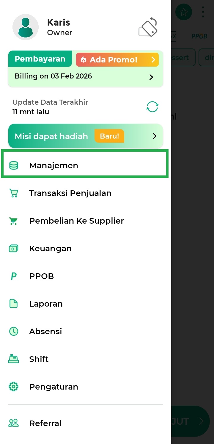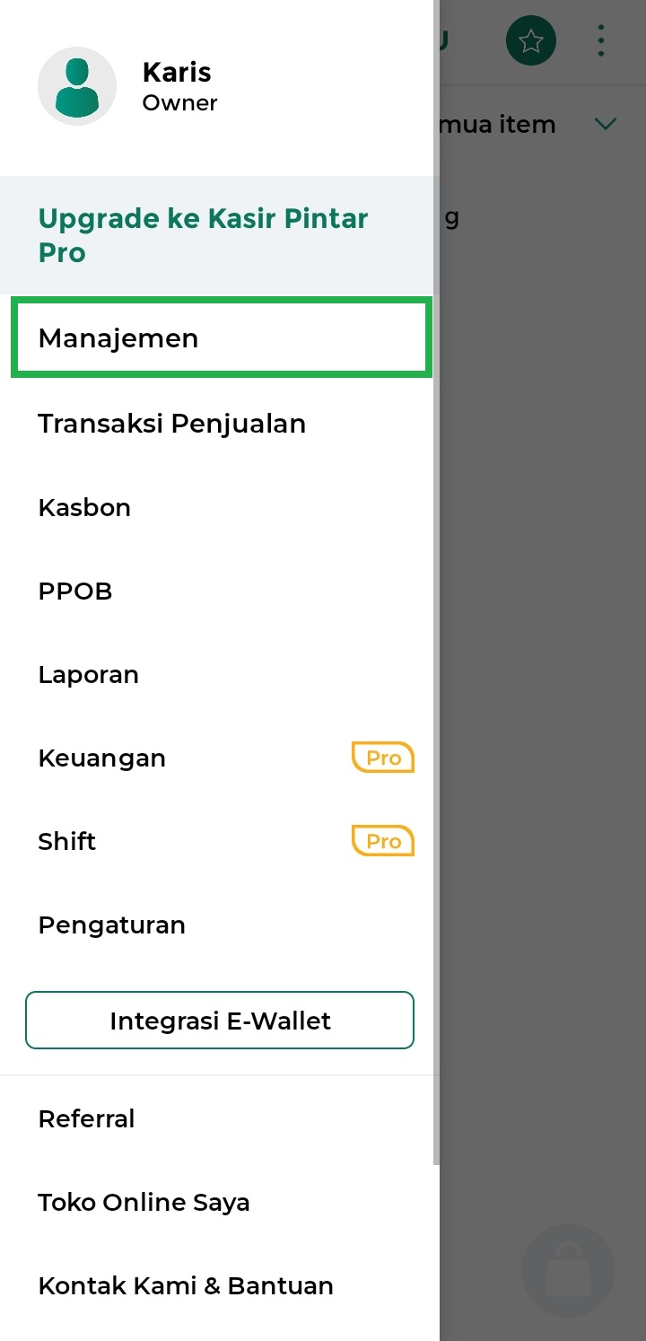 1. Buka aplikasi Kasir Pintar Pro dan klik ikon garis tiga di pojok kiri atas untuk membuka menu sidebar.