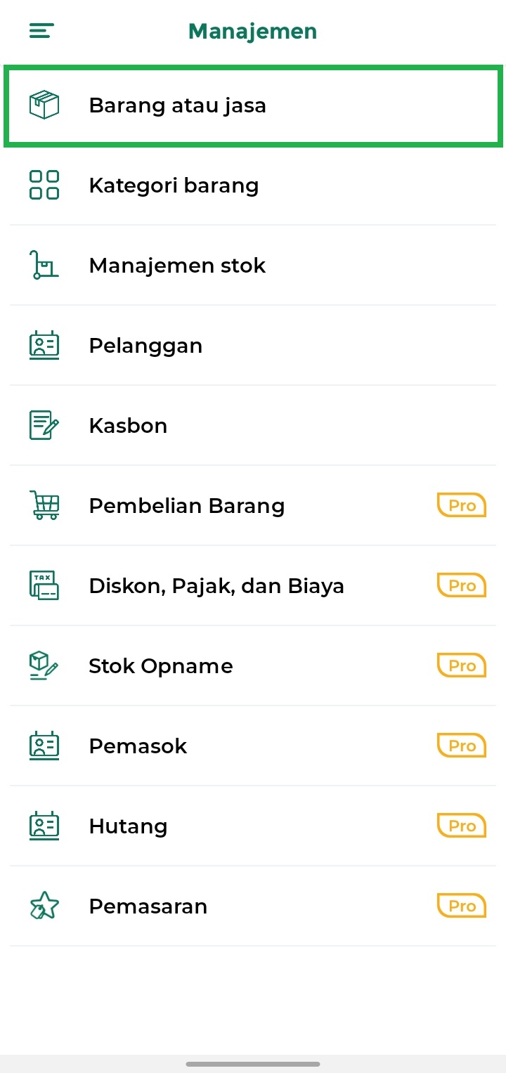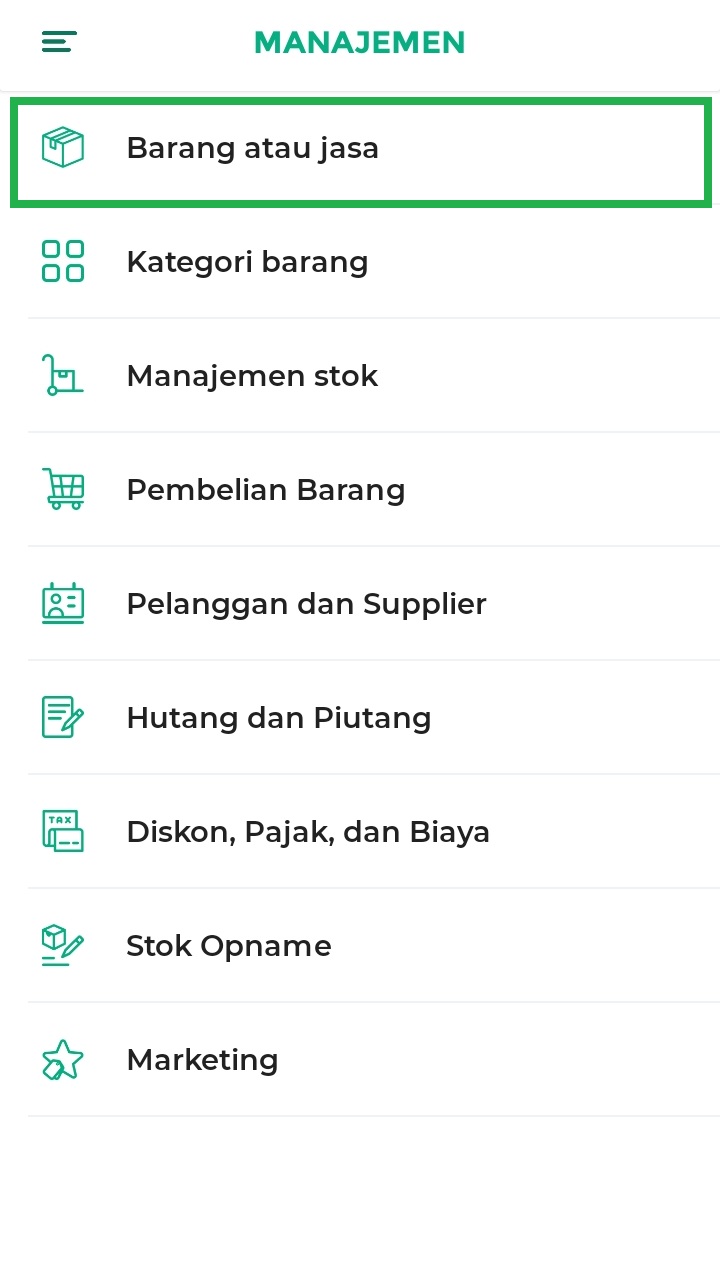 3. Pilih opsi Barang atau Jasa untuk mengelola data barang atau jasa yang ada di toko Anda.