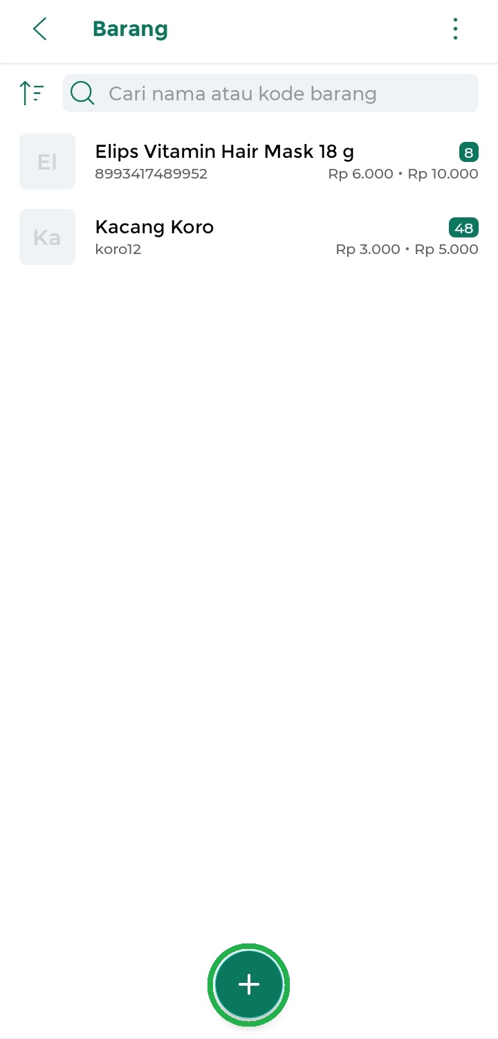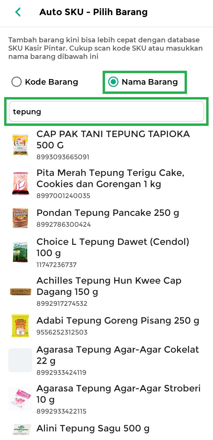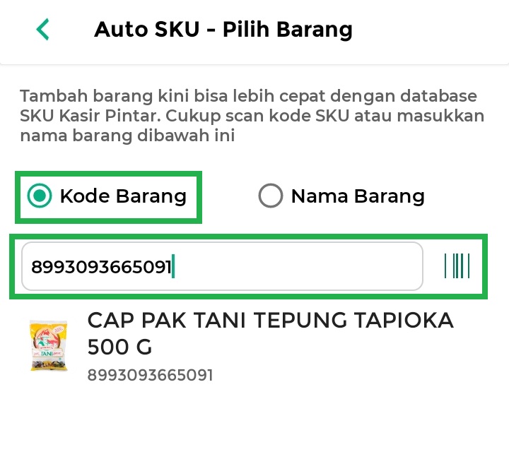 Jika kode atau nama barang yang dimasukkan cocok dengan database di SKU Kasir Pintar, saran barang akan muncul di bawah kolom pencarian.