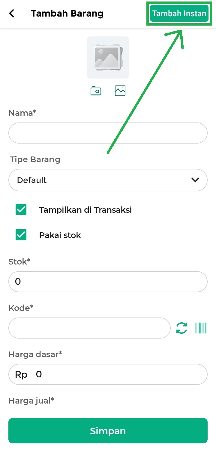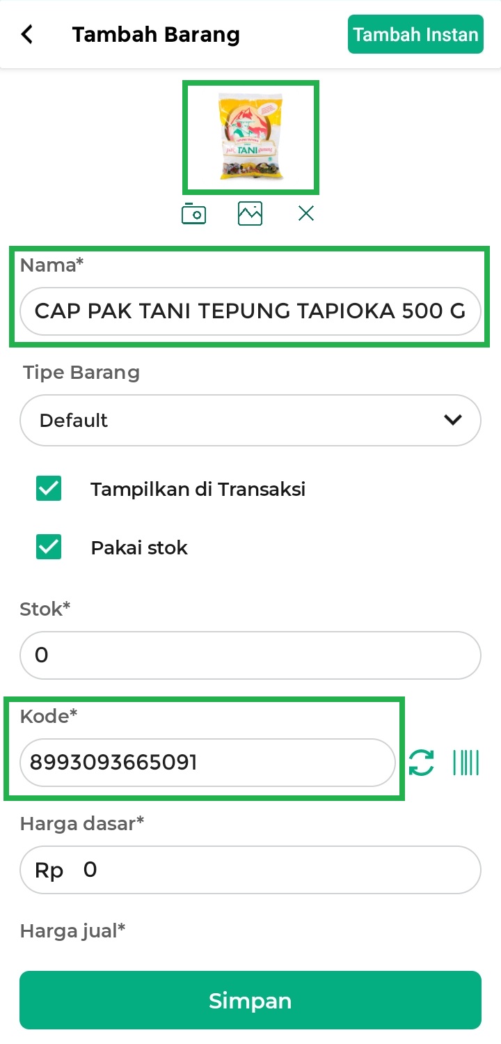 5. Selanjutnya, Anda akan diarahkan ke halaman Tambah Barang untuk menambahkan barang. Klik tombol Tambah Instan untuk menambahkan data barang secara otomatis dari SKU Kasir Pintar.