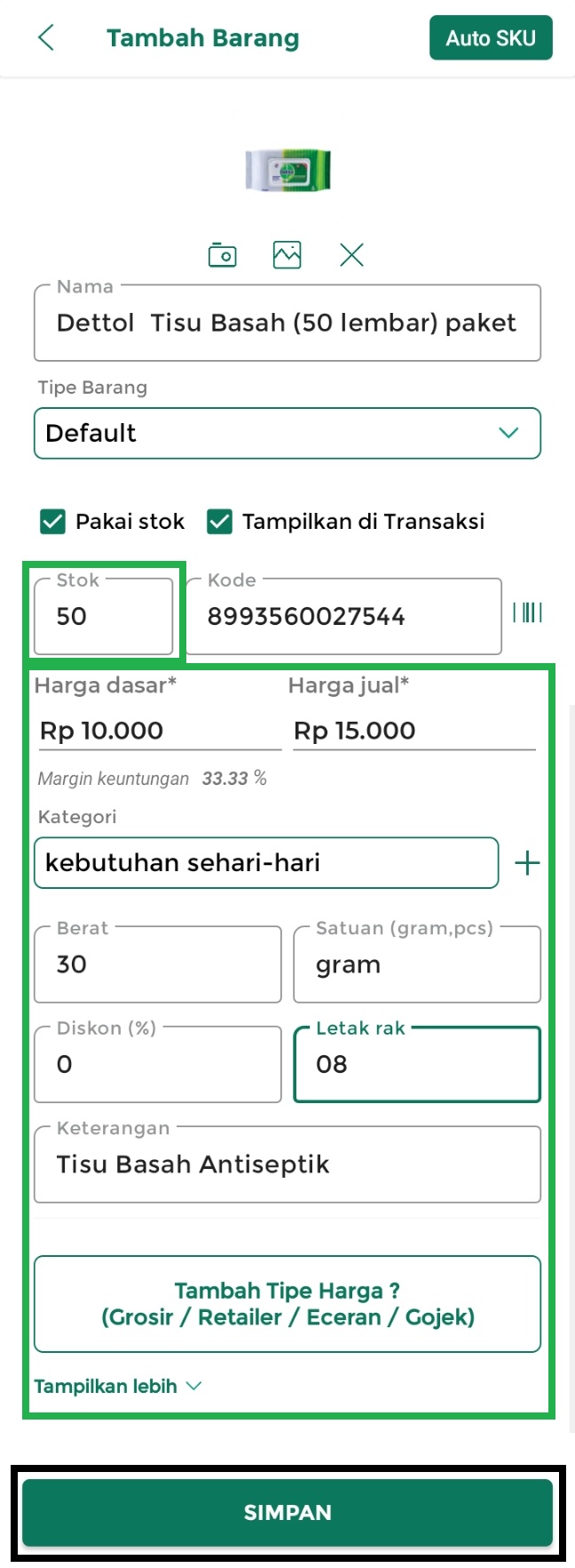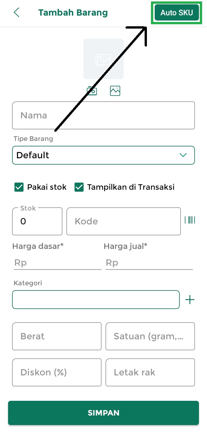 5. Anda akan diarahkan ke halaman Tambah Barang untuk menambahkan barang. Klik tombol Auto SKU untuk menambahkan data barang secara otomatis dari SKU Kasir Pintar.