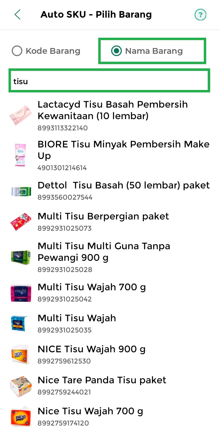 6. Pilih kategori pencarian SKU berdasarkan Kode Barang atau Nama Barang.