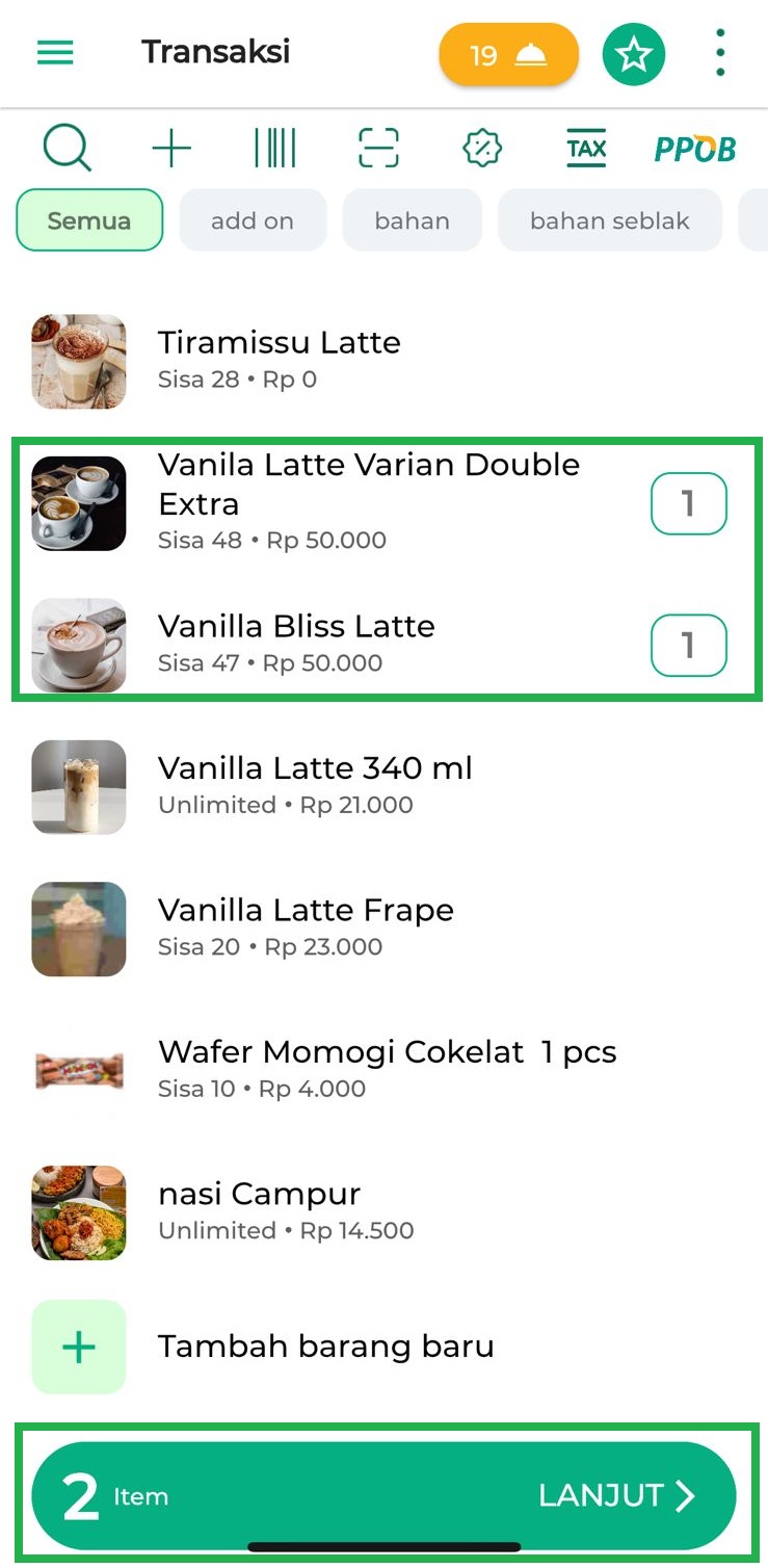 - Cari dan pilih barang yang akan ditransaksikan, lalu tambahkan data lain seperti diskon, pajak, dan transaksi tambahan jika diperlukan. Klik tombol Lanjut.