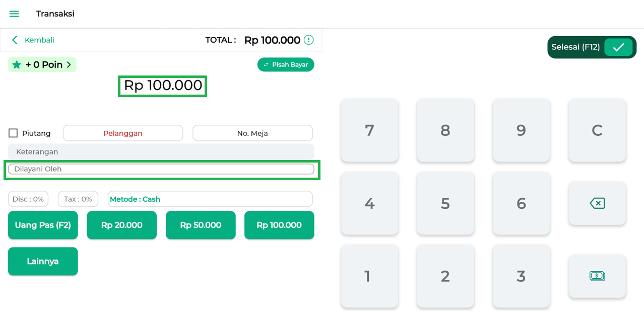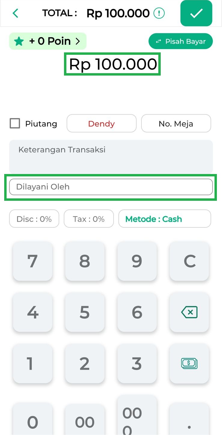- Masukkan Nominal Pembayaran dan data pembayaran lainnya seperti nama pelanggan, No.Meja, Diskon, atau Pajak sesuai kebutuhan. Selanjutnya, klik tombol “Dilayani Oleh”.