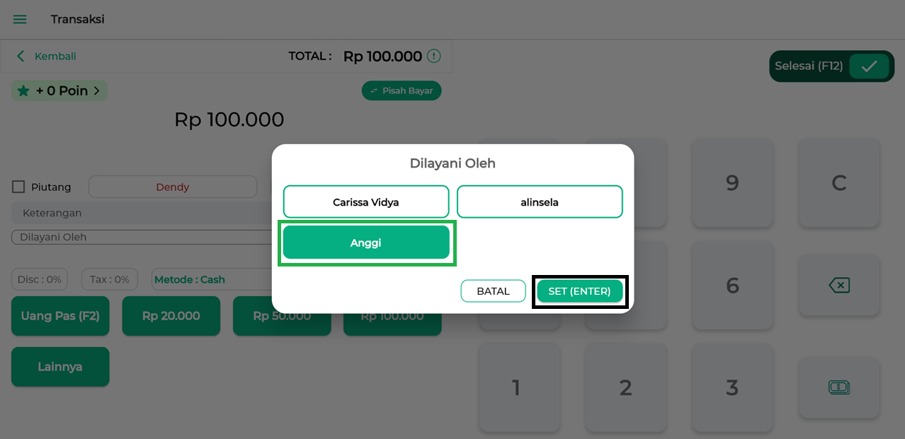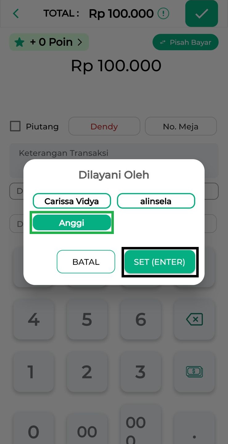 - Pilih nama staf yang untuk mendapatkan komisi dari penjualan yang dilakukan, lalu klik SET (ENTER).