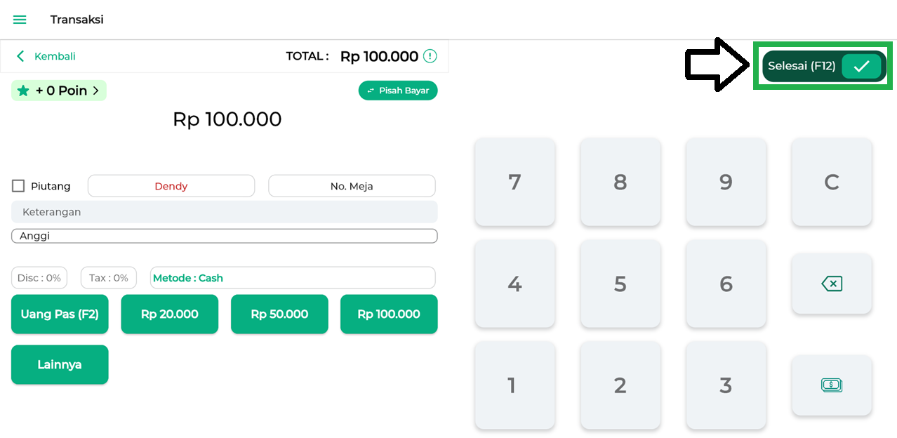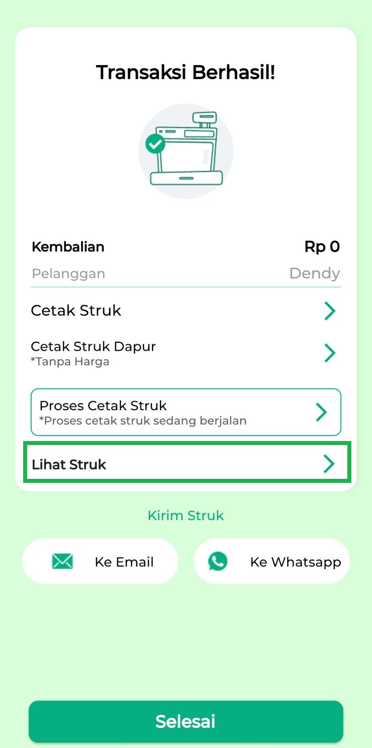 Lalu, klik tombol Selesai/ikon centang yang berada di sebelah pojok kanan atas untuk menyelesaikan transaksi penjualan.