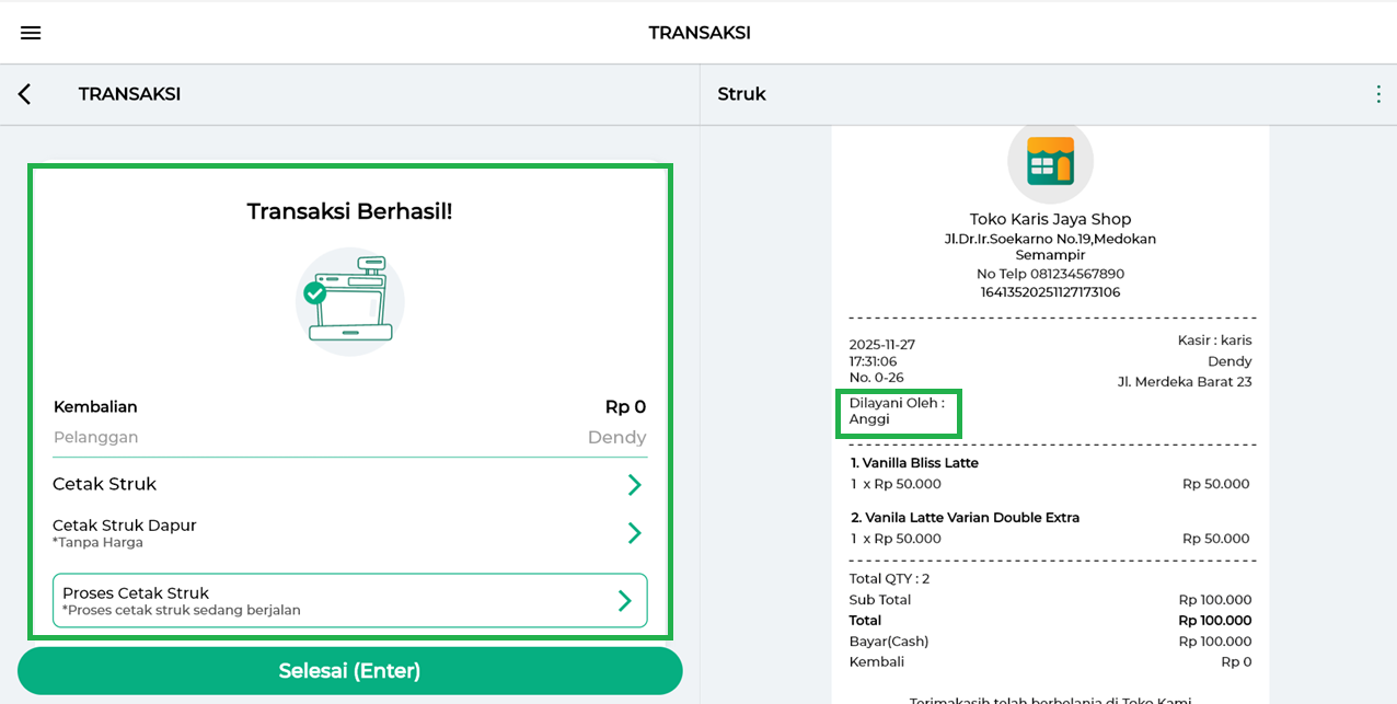 - Berikut merupakan contoh tampilan transaksi berhasil yang berada di sebelah kiri layar dan tampilan struk transaksi penjualan dengan Komisi Staf di sebelah kanan layar.