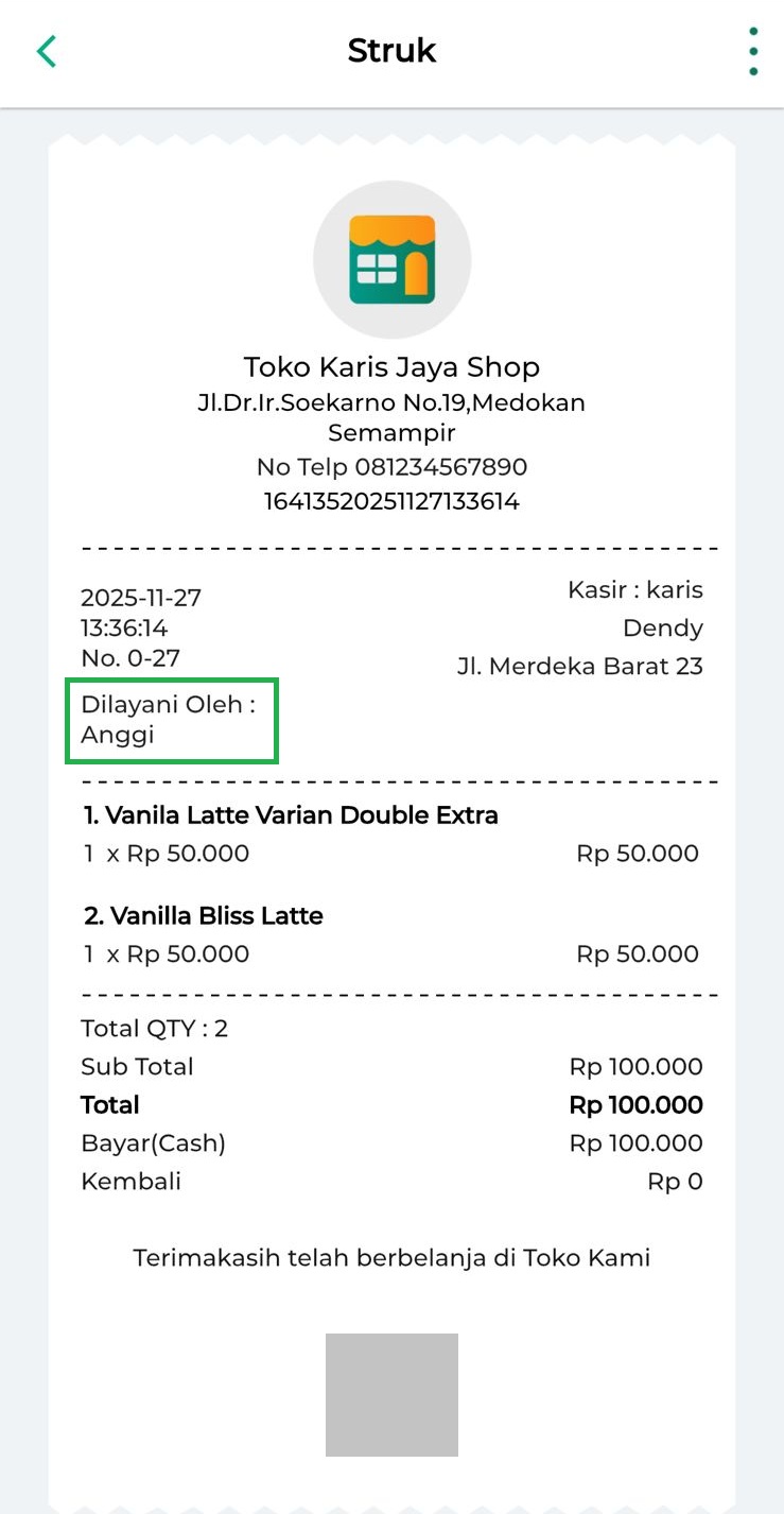 Berikut merupakan contoh tampilan struk transaksi penjualan dengan Komisi Staf.