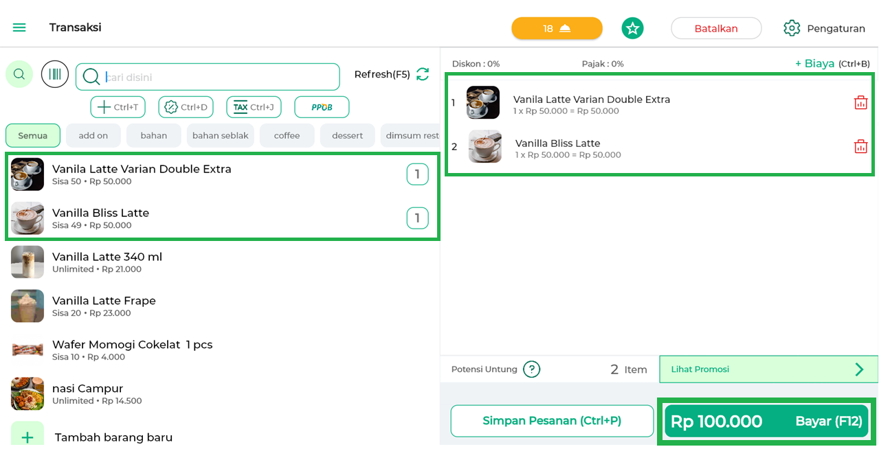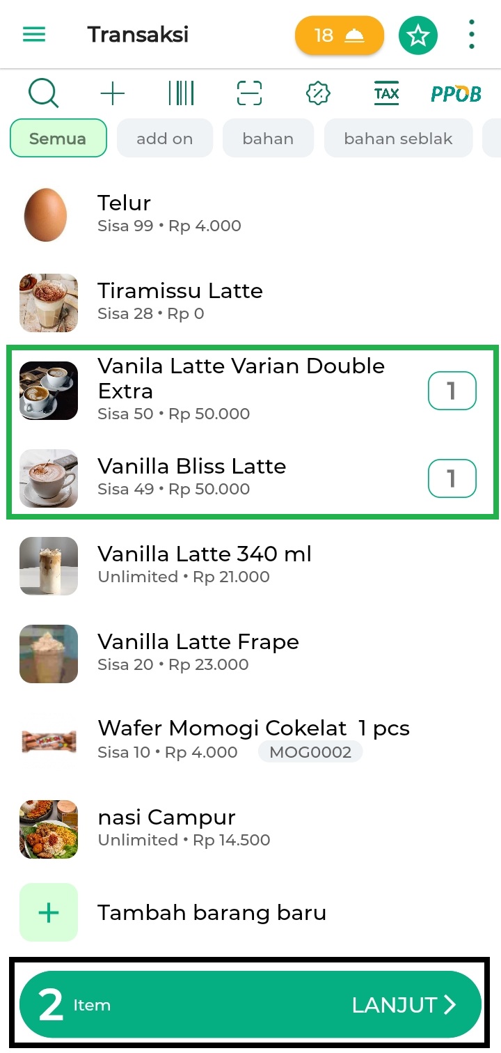 2. Cari dan pilih barang yang akan ditransaksikan, lalu tambahkan data lain seperti diskon, pajak, dan transaksi tambahan jika diperlukan. Klik tombol Lanjut.
