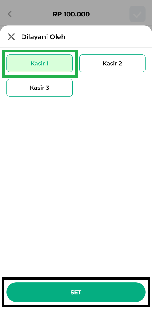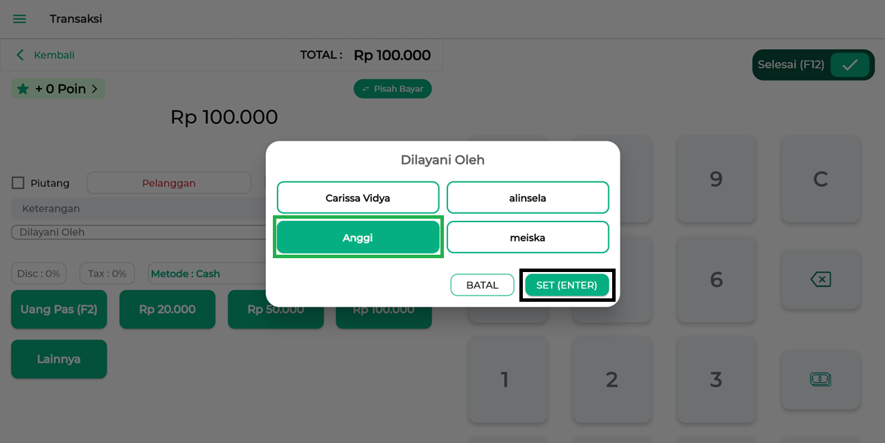 5. Pilih nama staf yang untuk mendapatkan komisi dari penjualan yang dilakukan, lalu klik SET.