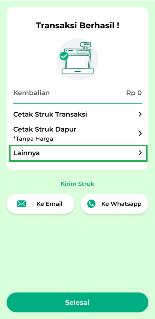 7. Transaksi penjualan dengan komisi staf berhasil dilakukan. Klik Lainnya > pilih opsi Lihat Struk untuk melihat struk transaksi penjualan dengan komisi.