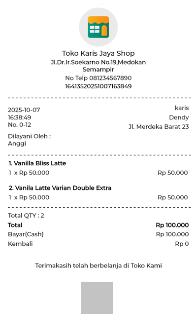 Berikut merupakan contoh tampilan struk transaksi penjualan dengan Komisi Staf.