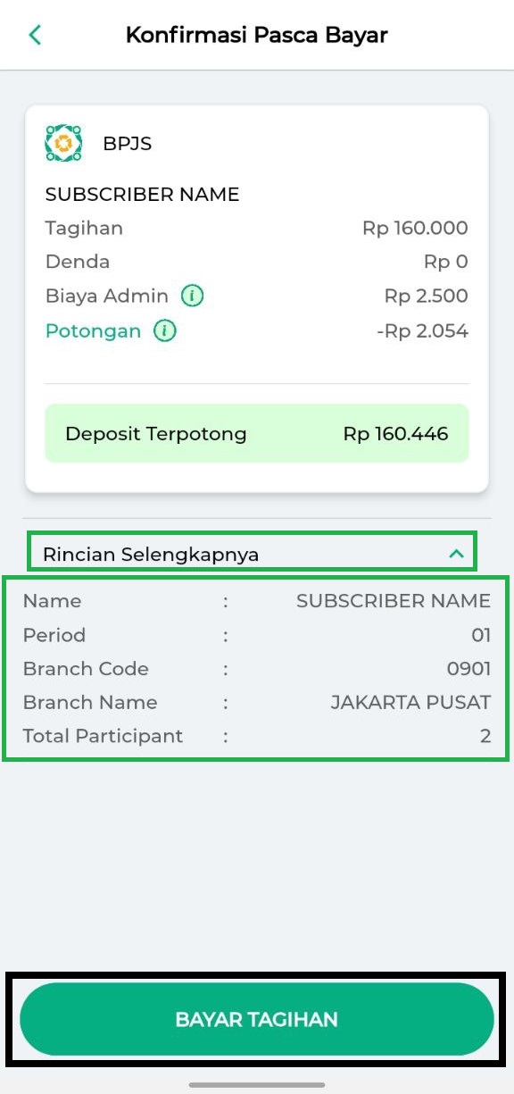 - Sistem akan menampilkan halaman konfirmasi pascabayar yang menampilkan data pembayaran BPJS seperti berikut.