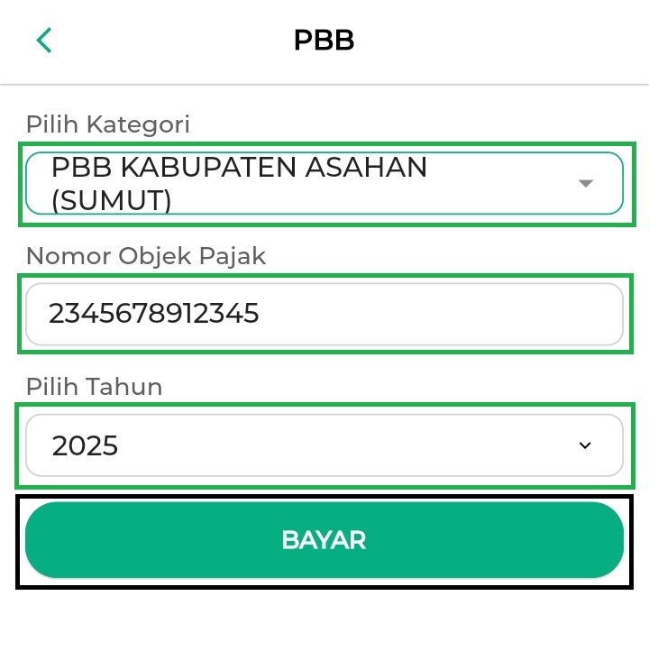 - Lengkapi beberapa data yang dibutuhkan seperti Kategori PBB Wilayah, Nomor Objek Pajak, dan Tahun Periode PBB. Setelah itu, klik Bayar.