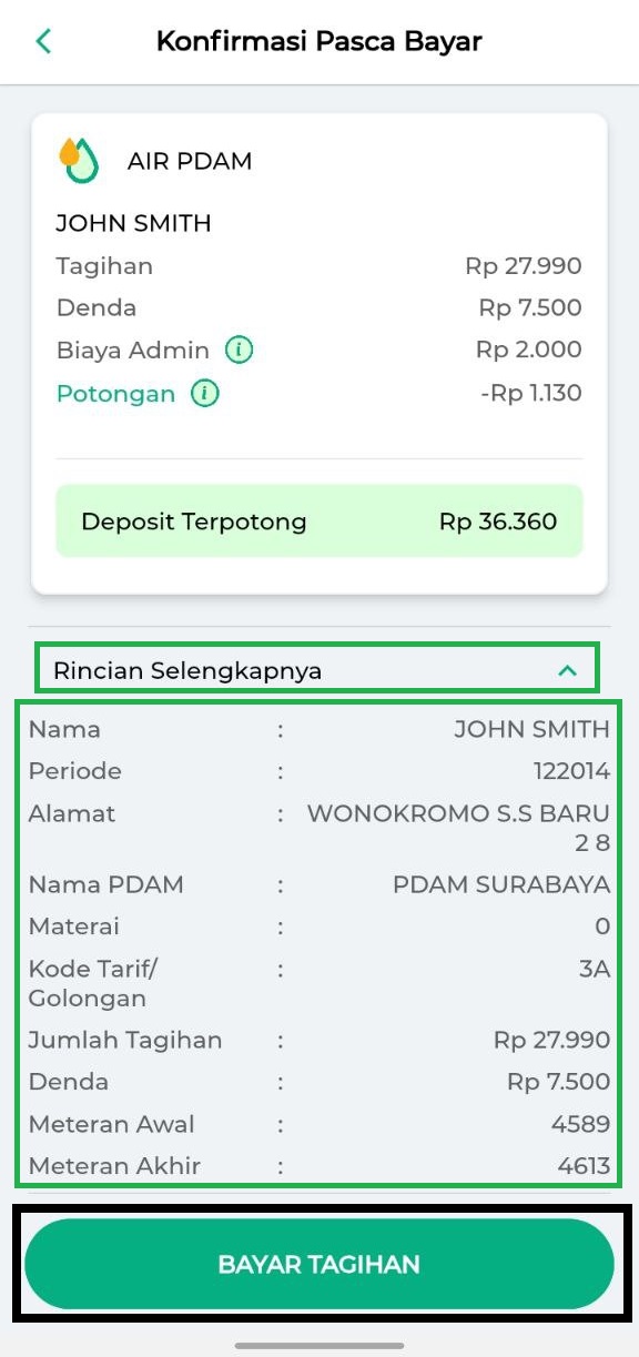Klik tulisan Rincian Selengkapnya untuk melihat detail tagihan. Apabila rincian tagihan yang ditampilkan sudah benar dan sesuai, klik BAYAR TAGIHAN.