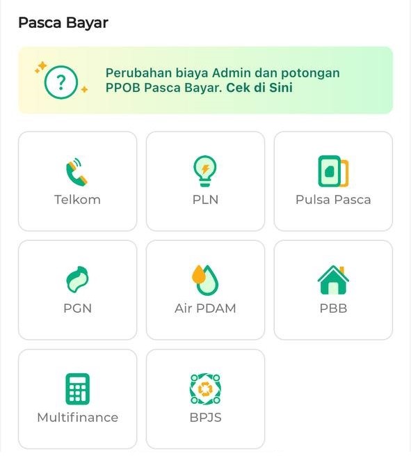 Pada kategori ini Anda dapat memilih produk Telkom, PLN, Pulsa Pascabayar, PGN, Air PDAM, PBB, Multifinance, dan BPJS.