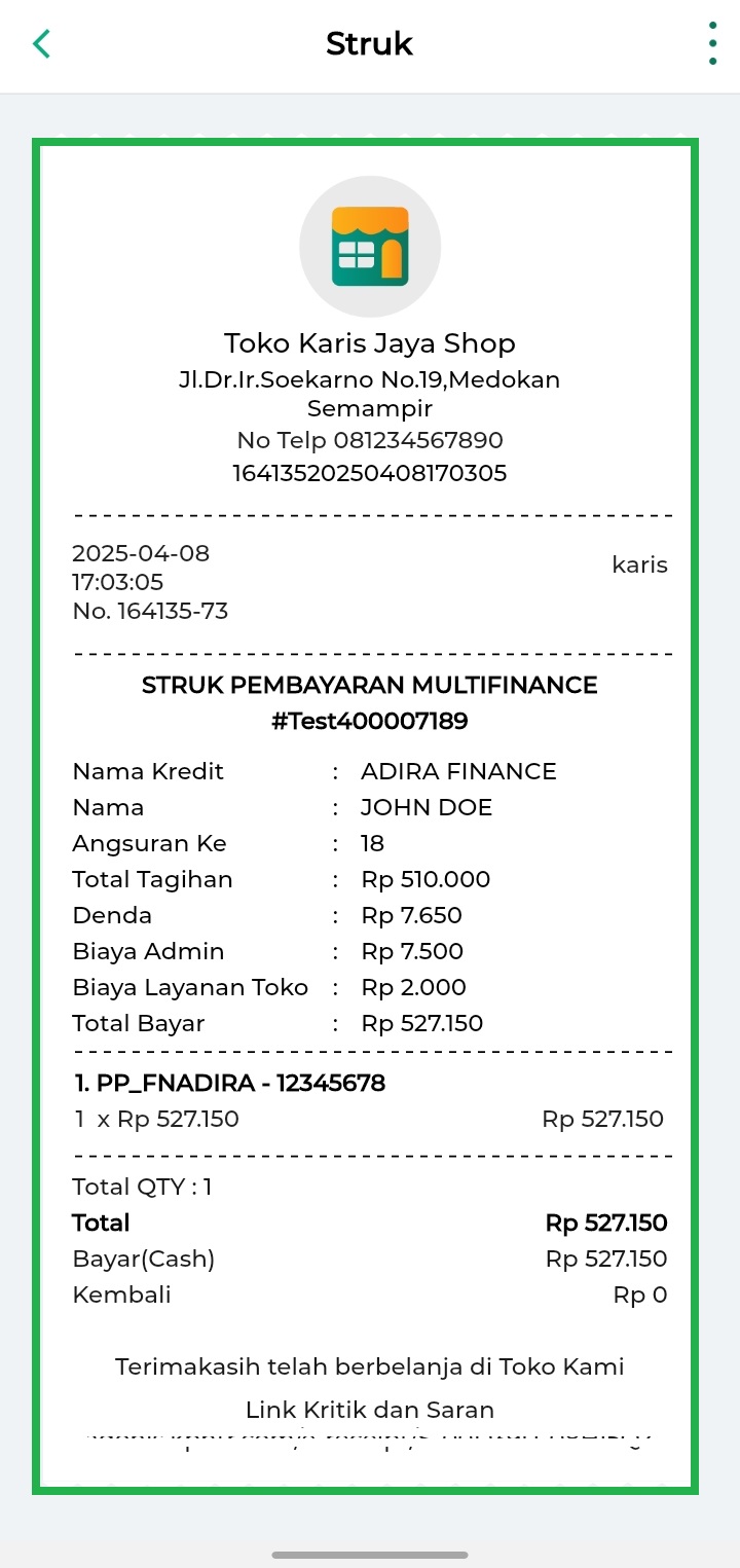 - Berikut merupakan contoh tampilan struk transaksi produk PPOB Multifinance.