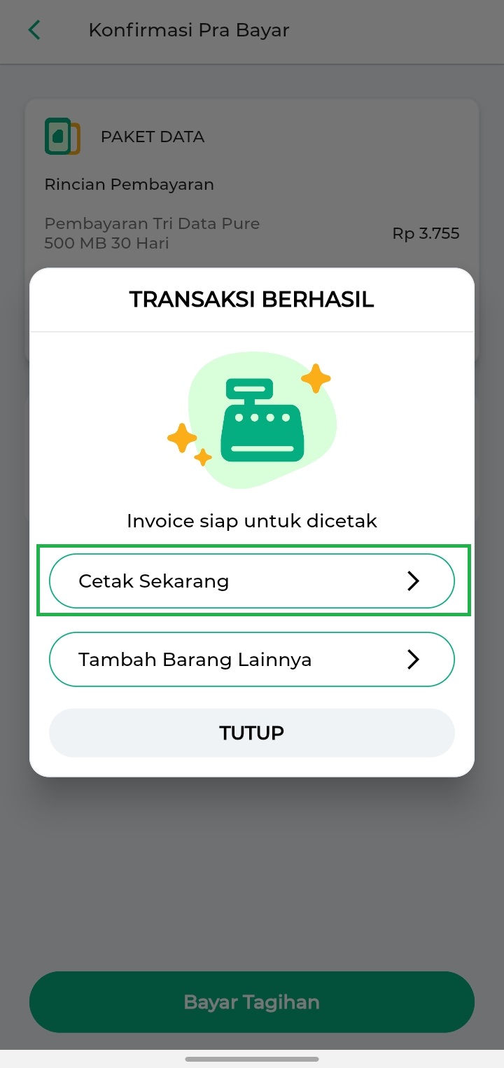 - Apabila sistem menampilkan notifikasi transaksi berhasil, klik Cetak Sekarang untuk mencetak struk transaksi PPOB Paket Data. Berikut merupakan contoh tampilan notifikasi transaksi berhasil.