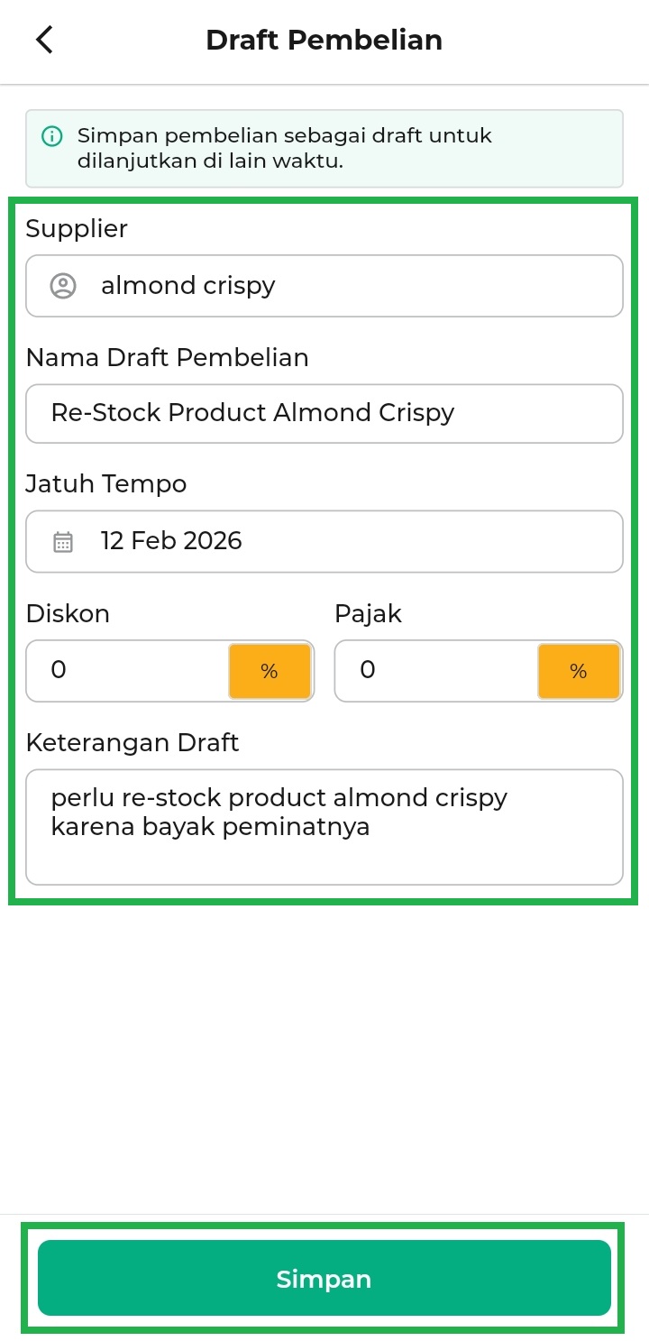 - Pada halaman draft pembelian, masukkan data yang diperlukan seperti: