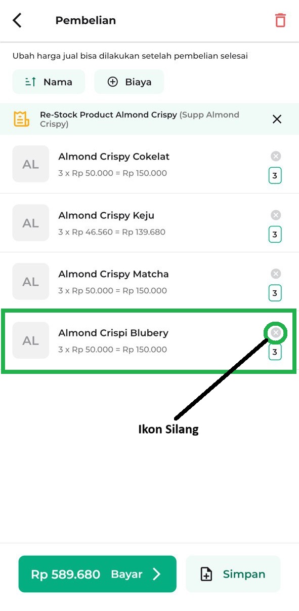 - Pilih barang yang akan dihapus, lalu klik ikon silang.