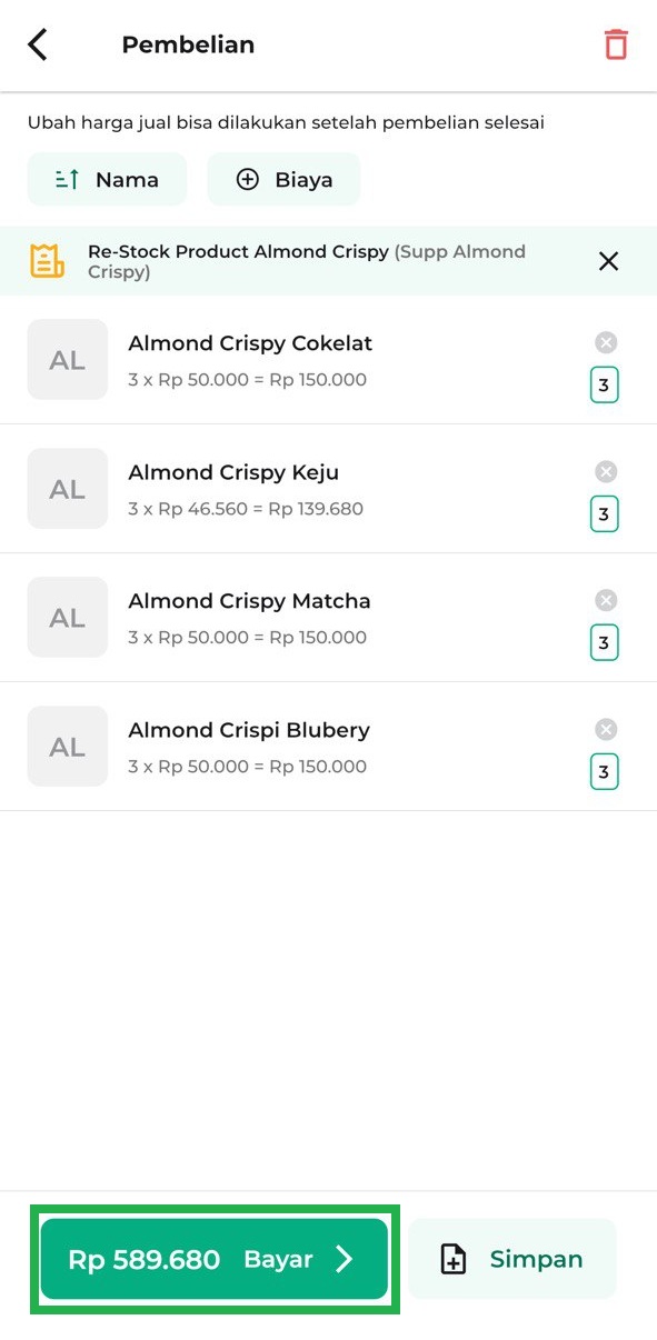 - Klik Bayar untuk meneruskan draft pembelian menjadi transaksi pembelian.