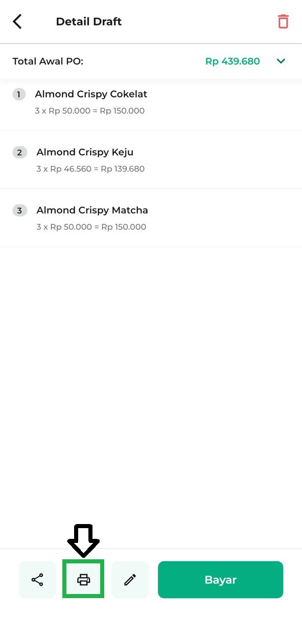 - Setelah melihat preview draft pembelian, klik ikon titik tiga di sebelah pojok kanan atas, lalu pilih opsi cetak.