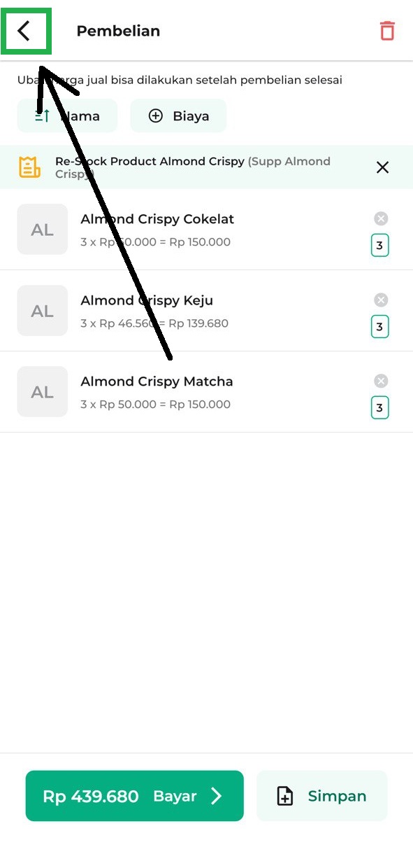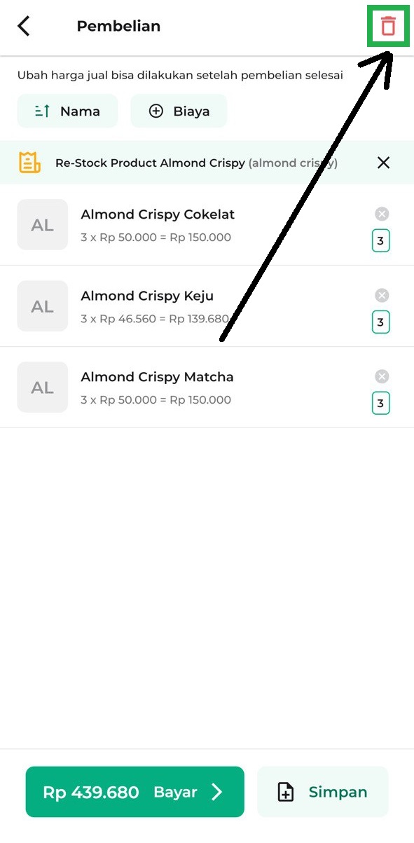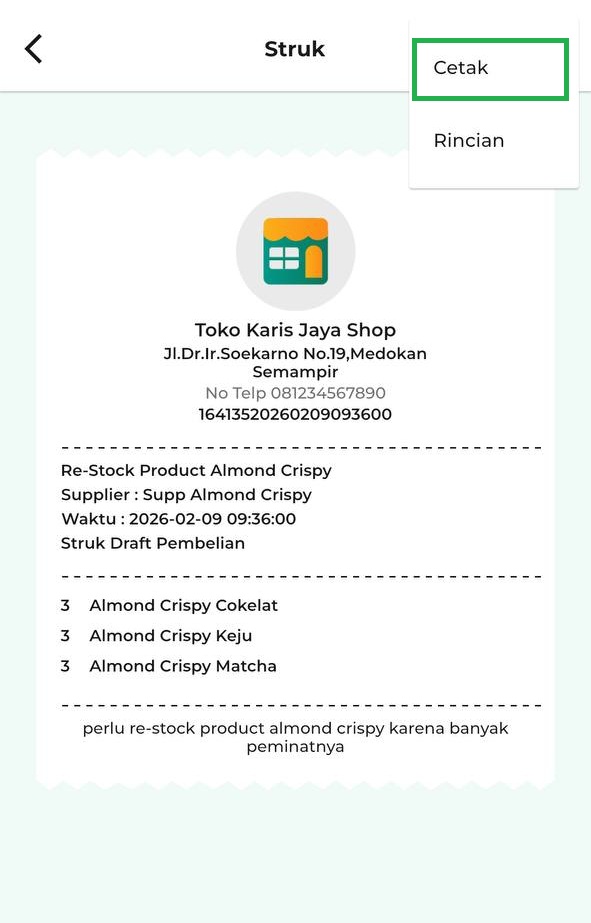 Setelah draft pembelian dibuat, langkah selanjutnya adalah meneruskannya menjadi transaksi pembelian ke supplier. Setelah transaksi selesai, stok barang akan otomatis bertambah dan diperbarui di aplikasi Kasir Pintar, sehingga data persediaan tetap akurat.