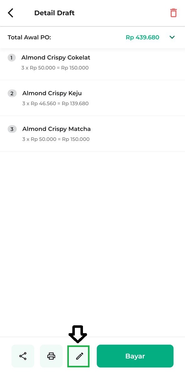 Klik ikon pensil untuk mengubah draft pembelian yang telah dipilih. Anda dapat menambah atau menghapus barang pada draft pembelian sesuai kebutuhan. Selain itu, Anda juga dapat membatalkan draft pembelian. Berikut cara mengedit draft pembelian: