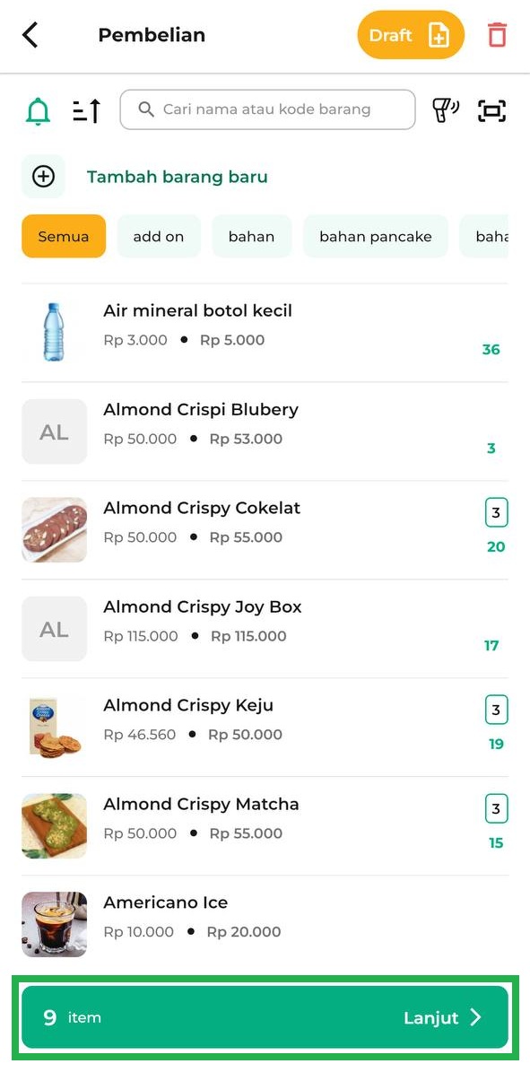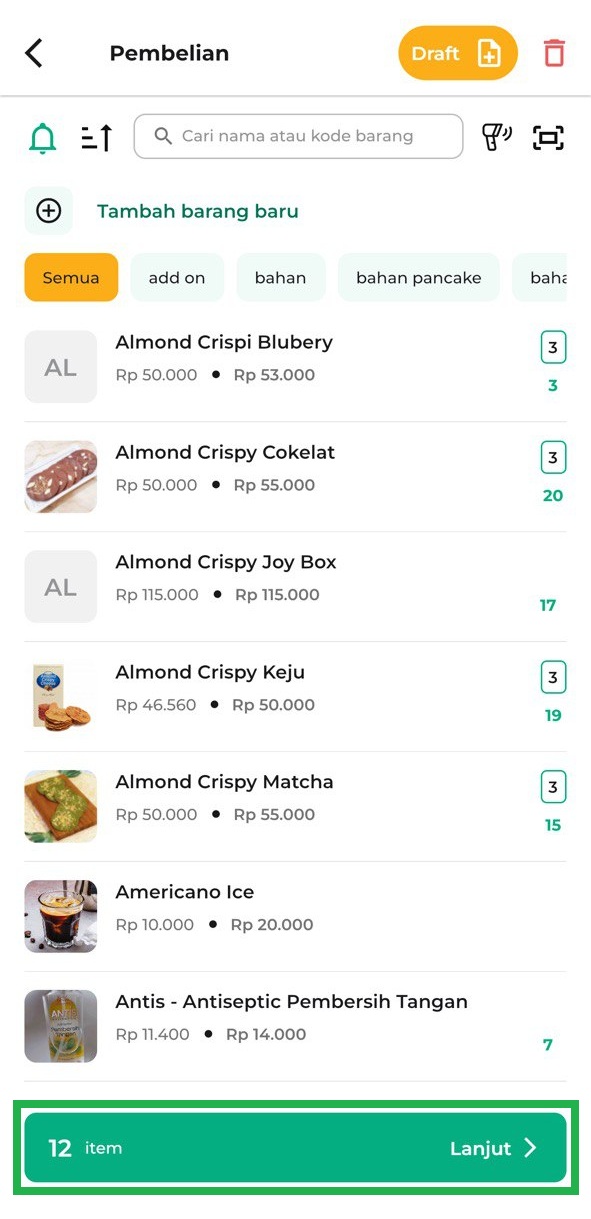 Berikut merupakan cara menambah barang pada draft pembelian yang telah dipilih:
