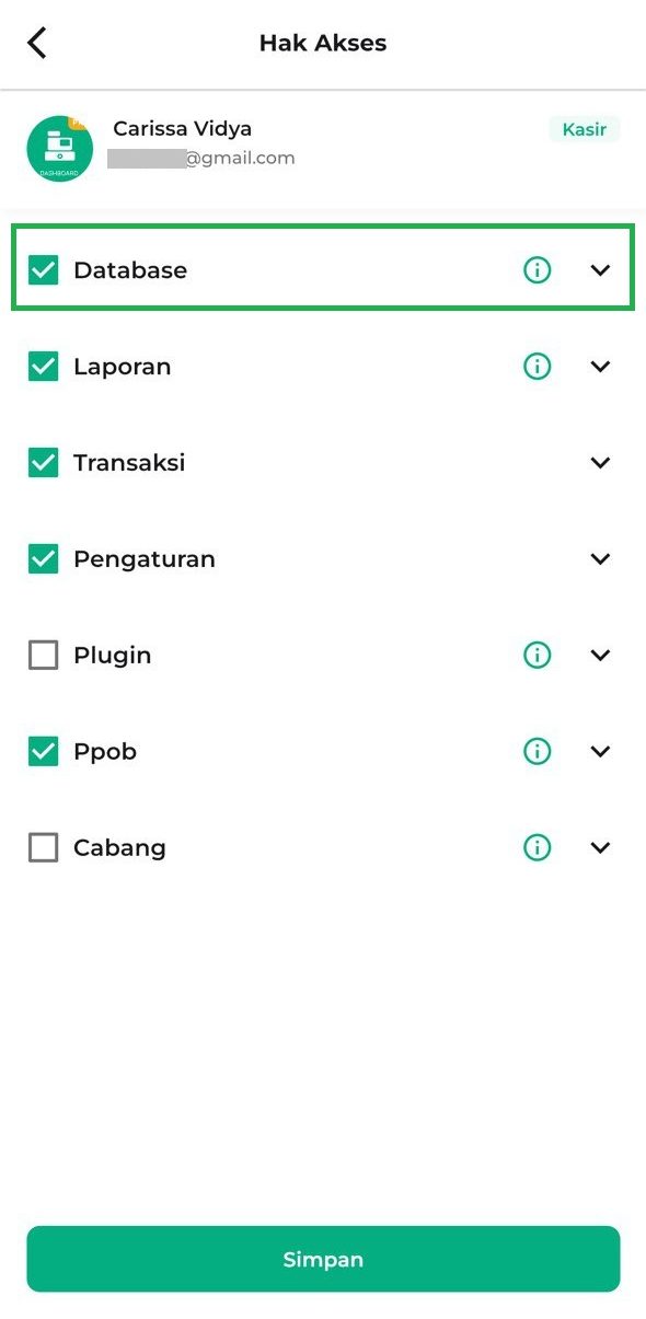 - Pilih opsi hak akases Database, lalu geser ke bawah hingga menemukan hak akses Pembelian Barang.
