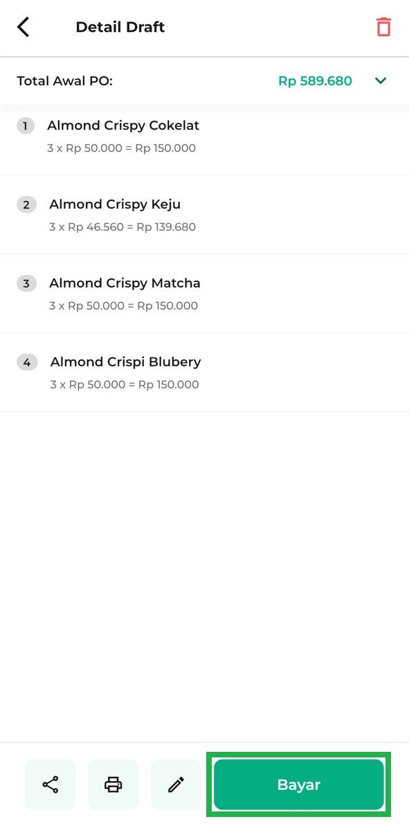- Pada halaman detail draft, Anda dapat melakukan beberapa tindakan seperti membagikan, mencetak, dan mengubah draft pembelian sesuai kebutuhan. Berikut merupakan penjelasannya: