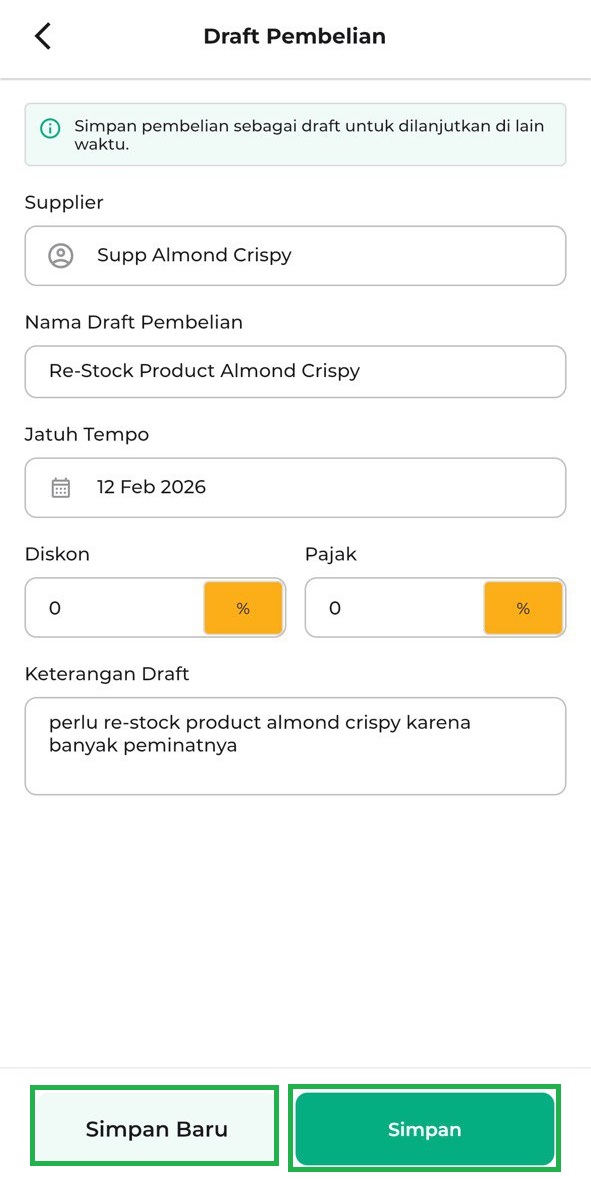 Jika memilih opsi Simpan, maka perubahan akan disimpan sebagai draft pembelian yang telah dipilih sebelumnya.