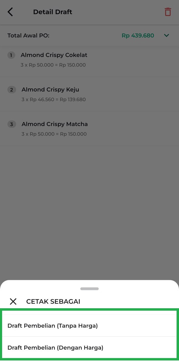 - Pilih format draft pembelian (Tanpa Harga atau Dengan Harga).