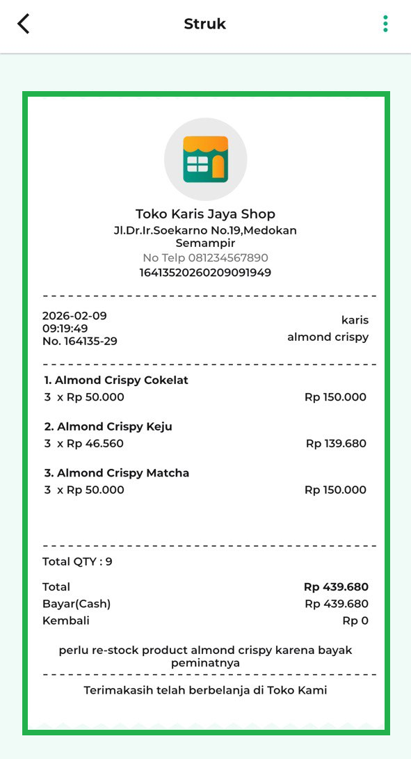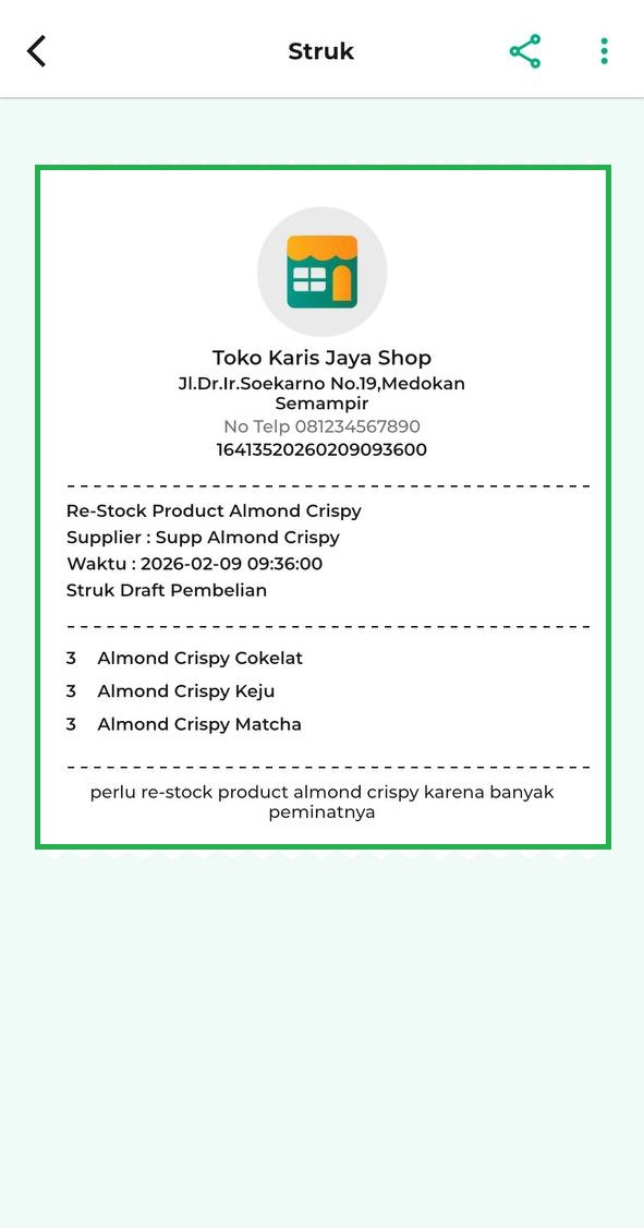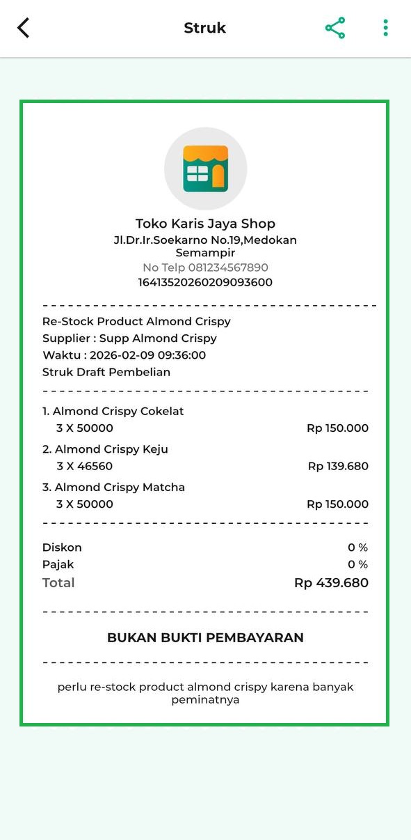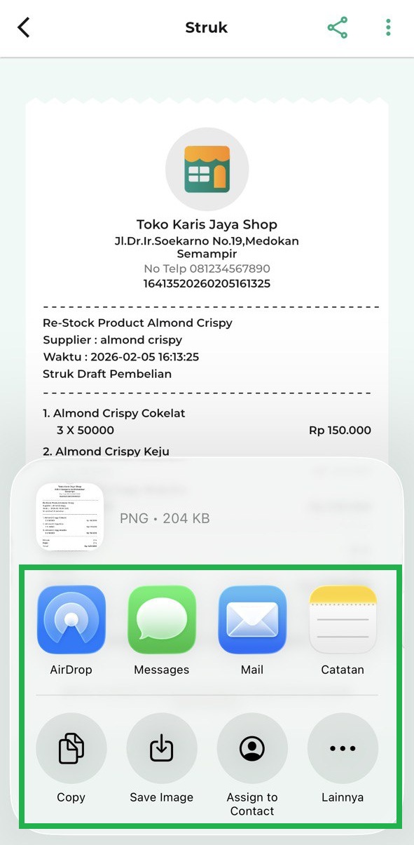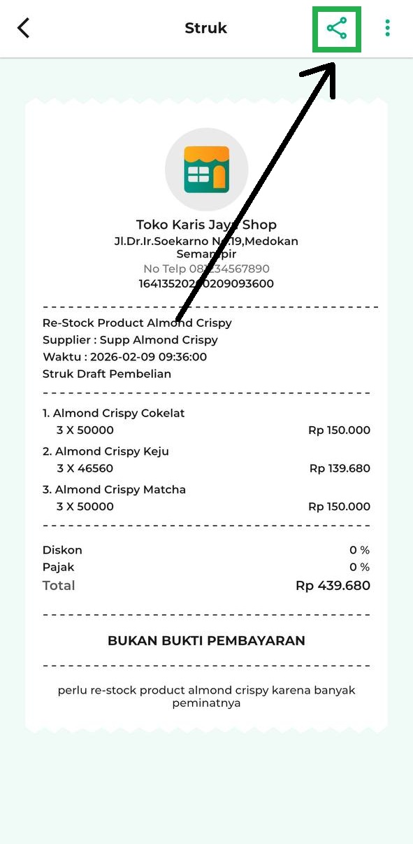 - Setelah melihat preview struk draft pembelian, klik ikon Share/Bagikan.
