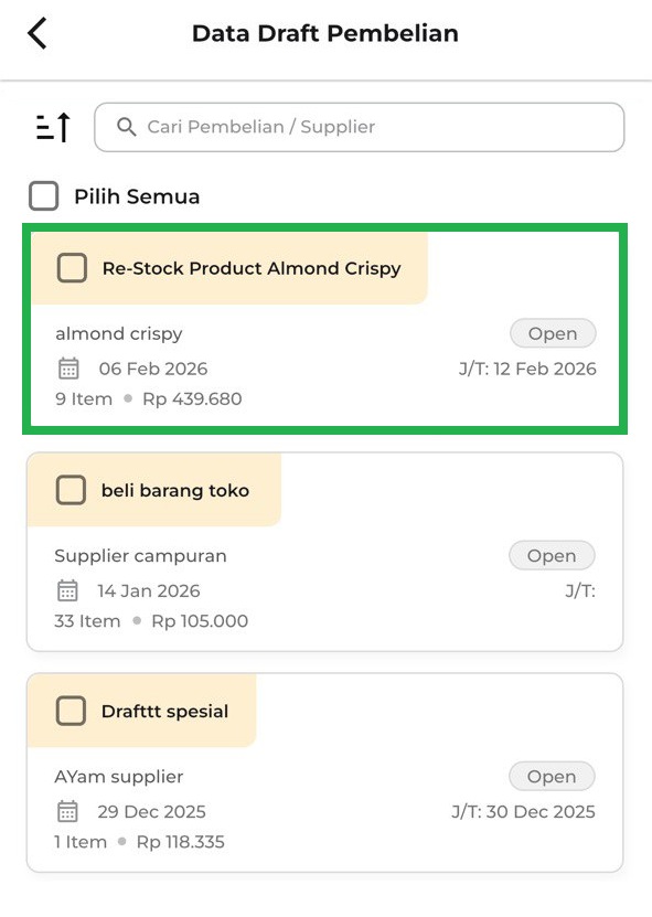 - Pilih draft pembelian yang akan ditambahkan barang.